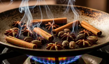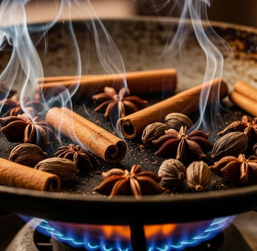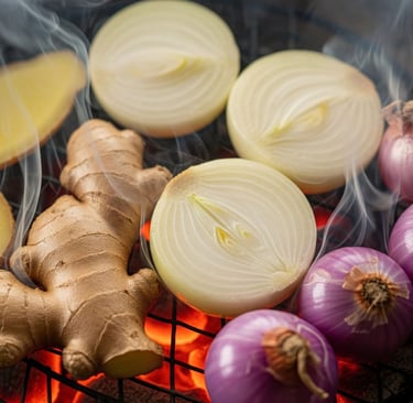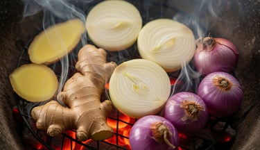 Bước 1: Rang Thơm Gia Vị Phở và Sơ Chế Gừng, Hành Tây.