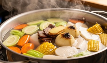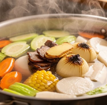 Bạn hãy nhắm mắt lại và cùng tôi cảm nhận nhé. Khi bạn hít một hơi thật sâu, cả căn bếp bỗng chốc ngập tràn mùi thơm thanh thoát của nước dùng. Đó không phải từ xương thịt, mà là từ những loại rau củ tươi ngon như su hào, cà rốt, củ cải, ngô ngọt, được ninh kỹ lưỡng hàng giờ đồng hồ. Tất cả hòa quyện cùng hương nồng nàn, ấm áp của hồi, quế, thảo quả – những gia vị "linh hồn" của phở. Một mùi hương đủ sức đánh thức cả những tâm hồn đang "ngủ quên"!