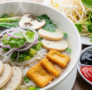 Nước dùng phở chay trong veo như pha lê, ngọt thanh tự nhiên và không hề gợn vẩn đục. Khi chan vào bát, nó bốc hơi nghi ngút như một lời mời gọi ân cần. Từng sợi phở mềm mượt, trắng ngần, nhẹ nhàng trôi trong làn nước dùng ấm áp, kết hợp với sự góp mặt của các loại "topping" chay đa dạng và hấp dẫn. Đó là những lát nấm đùi gà thái mỏng dai ngon như thịt, những miếng đậu hũ chiên vàng ươm, béo bùi, hay những lát chả lụa chay mềm mại. Điểm xuyết trên mặt bát phở là màu xanh mướt của hành lá, ngò gai, và những lát hành tây bào mỏng giòn tan. Khi vắt thêm chút chanh tươi, vị chua dịu nhẹ sẽ làm bừng sáng mọi giác quan, khiến bạn phải xuýt xoa khen ngon.